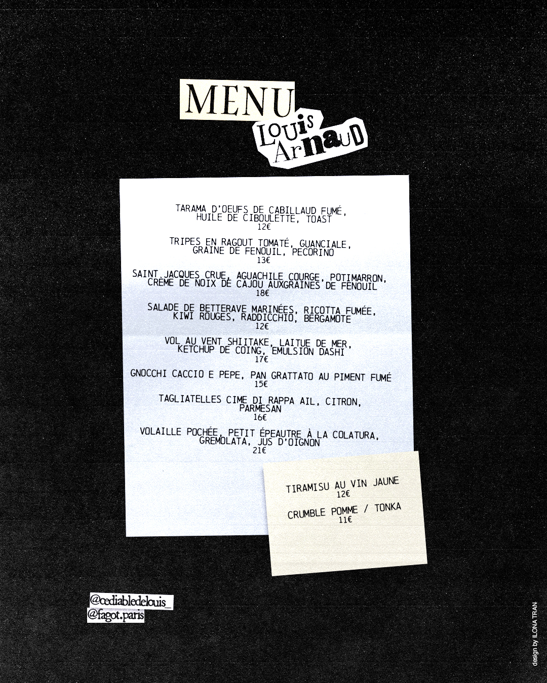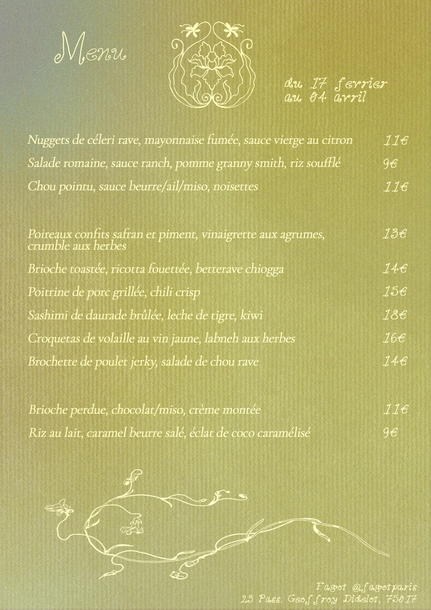 Conscient de l’impact écologique que notre métier implique, Fagot et ses résidents tendent à cuisiner pour vous une carte variée, respectant la saisonnalité et la notion d’anti-gaspillage en travaillant ses produits dans toutes leurs utilités pour votre plaisir et votre santé.